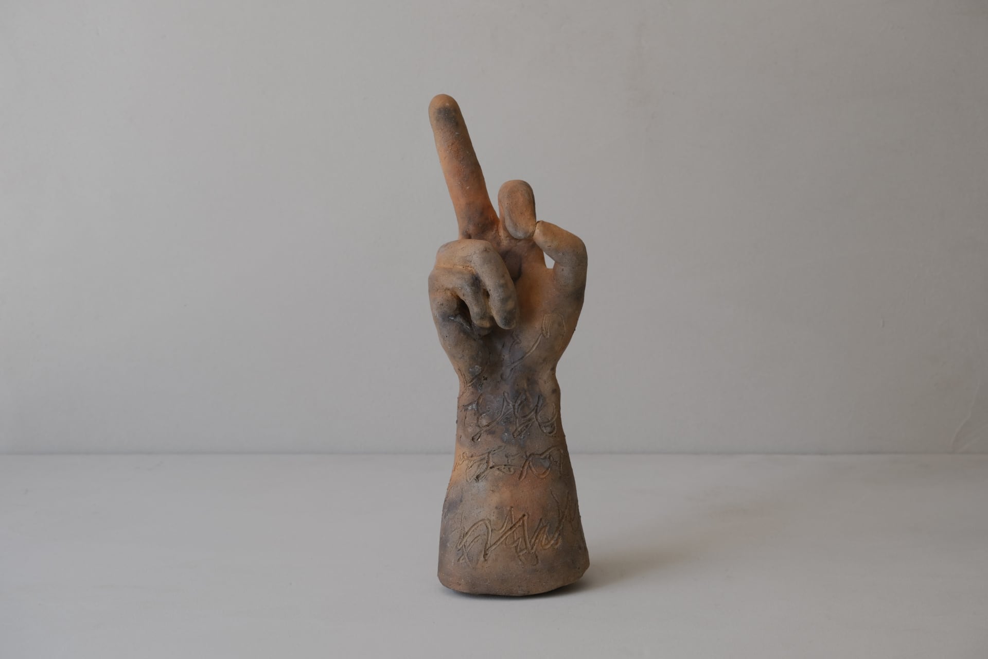 ※ご購入前に「ABOUT」にある「Shopping guide」を必ずご確認ください。 size(cm) w12.0×d13.0×h35.0 外山慧個展「確か」出展作品。 千葉で採掘した土を原土のまま成形し、野焼きで焼成しています。 腕の部分には平仮名で書かれたメッセージが彫り込まれ、さながらタトゥーのように模様が展開しています。 手と具 / 外山慧